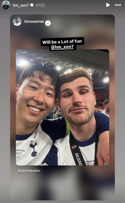 베르너의 이적 소식이 전해지자 손흥민도 반응했다. 현재 LAFC에서 뛰고 있는 손흥민은 자신의 소셜 미디어 계정에 베르너의 게시물을 공유했다. 미국 무대에서의 새 출발을 축하하는 메시지를 담은 것이다. 베르너는 과거 토트넘 시절 손흥민과 함께 유로파리그 우승을 자축하던 사진을 올렸다.